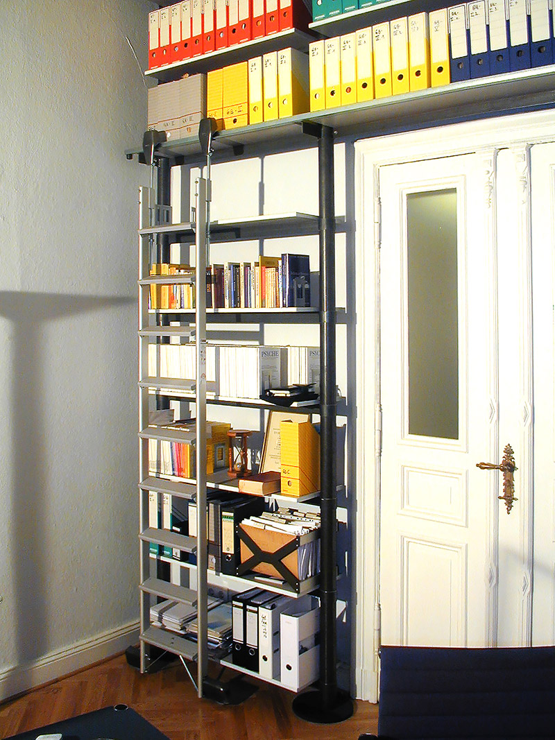 Eine fahr- und schwenkbare Leiter für den angenehmen Komfort des professionellen Lesers.